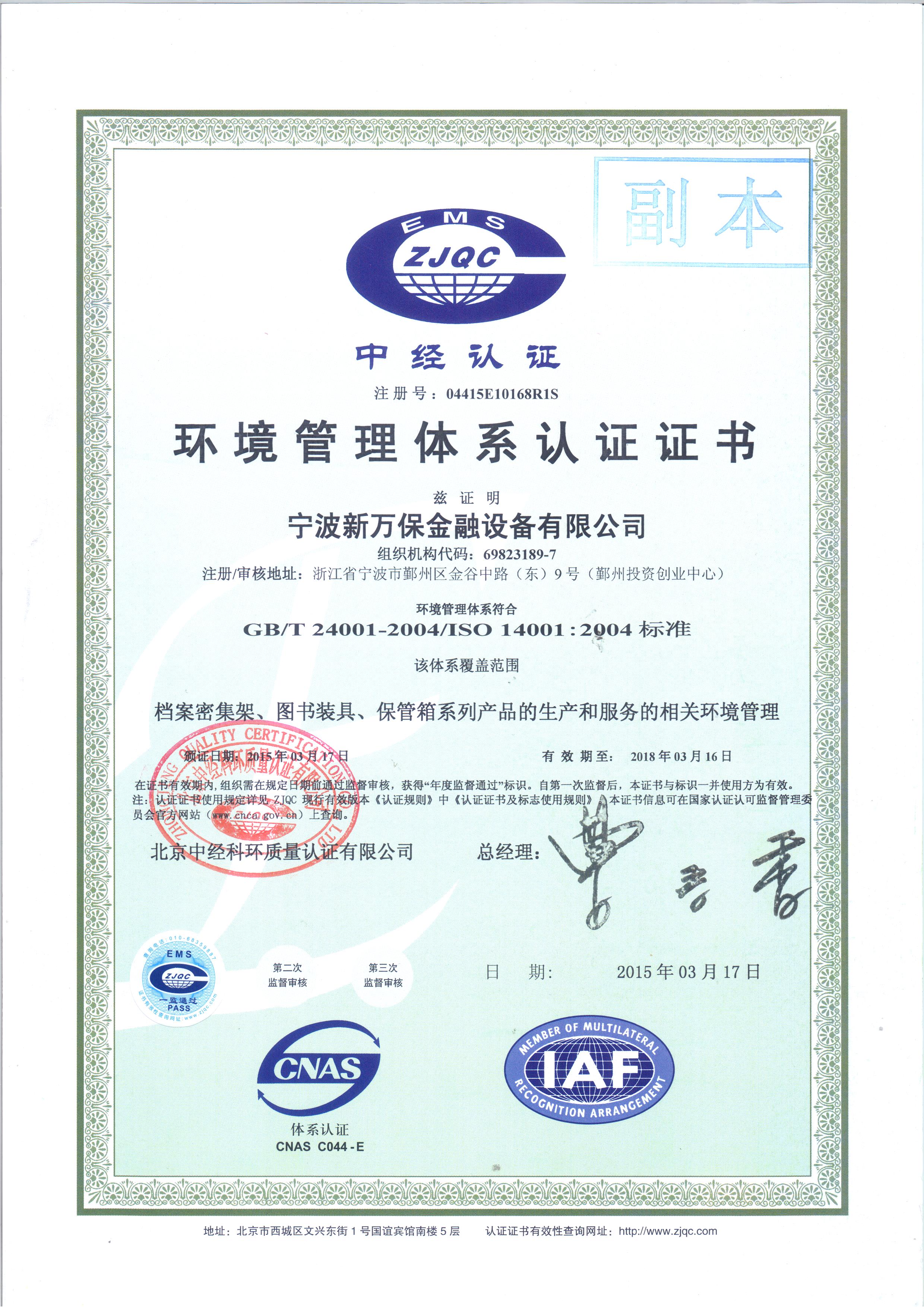 環(huán)境管理體系認(rèn)證證書(shū)