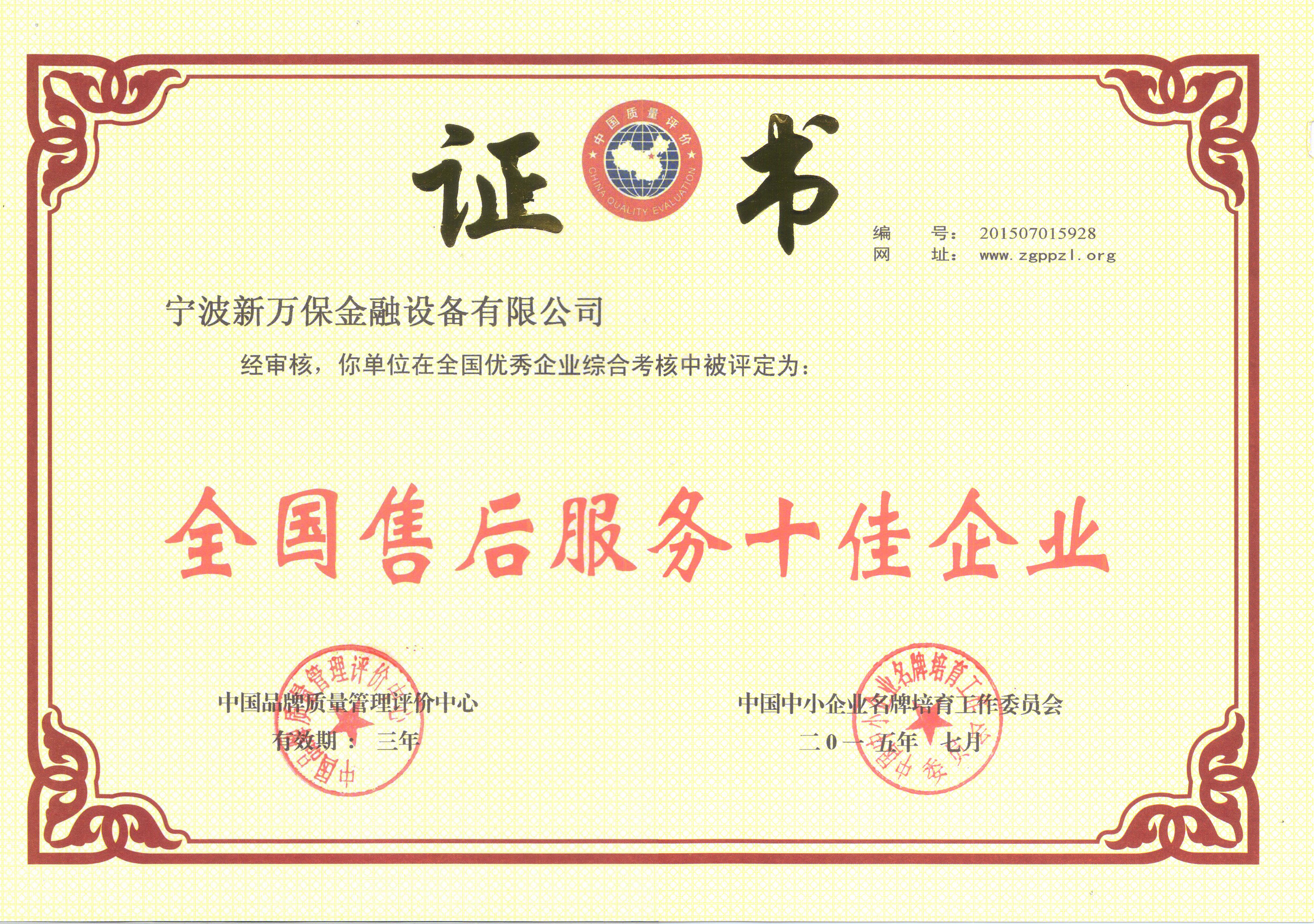 全國(guó)售后服務(wù)十佳企業(yè)證書(shū)